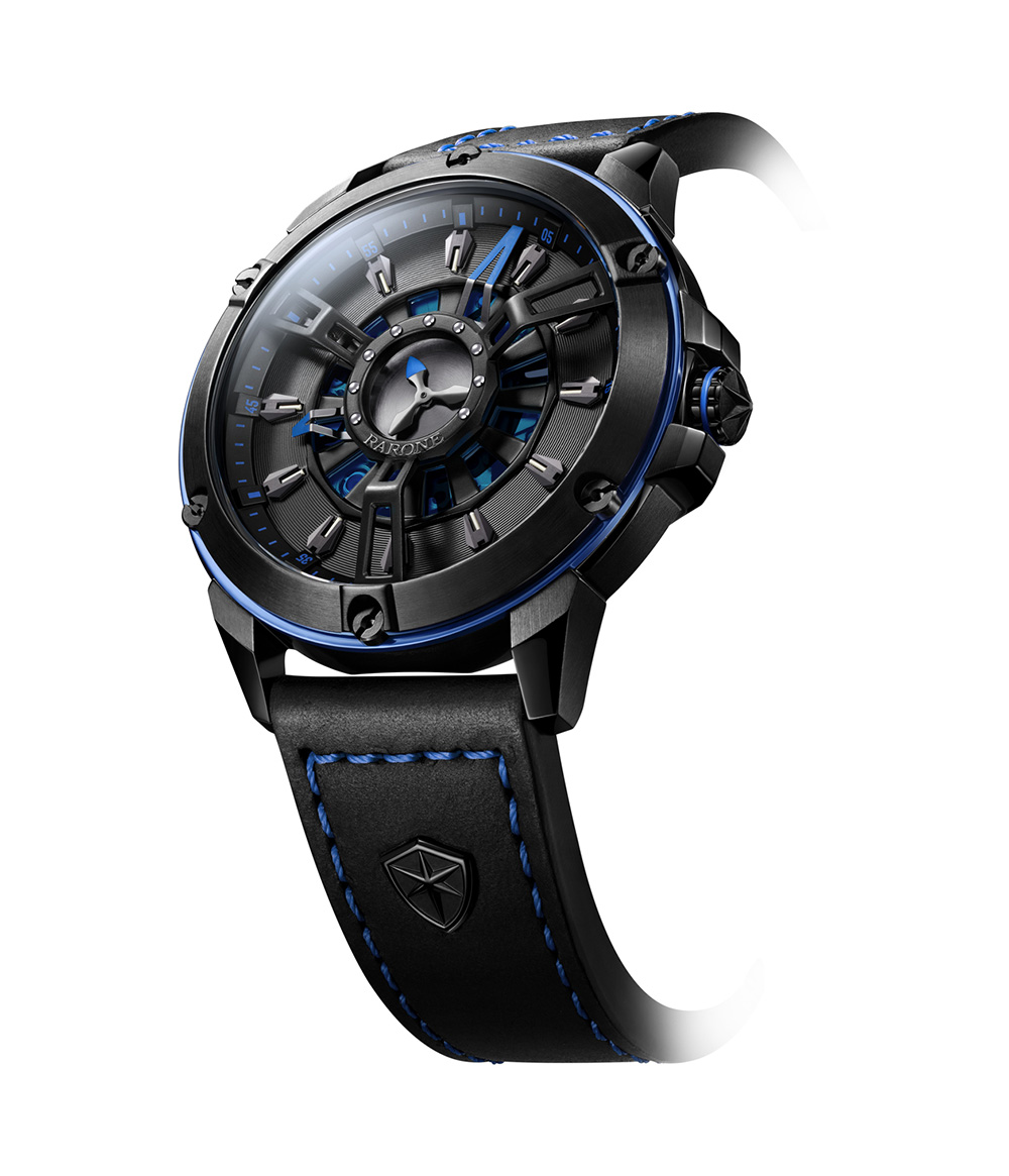 多層疊加的表盤設計搭配繁復制作工藝,造型張弛有力,字面將古羅馬戰(zhàn)車車輪、鉚釘、盾牌等獨特元素巧妙運用,表款整體設計錯落有致,透過表盤的折疊式秒針以及中間鏤空的戰(zhàn)車車輪造型,可見機械機心的律動之美!